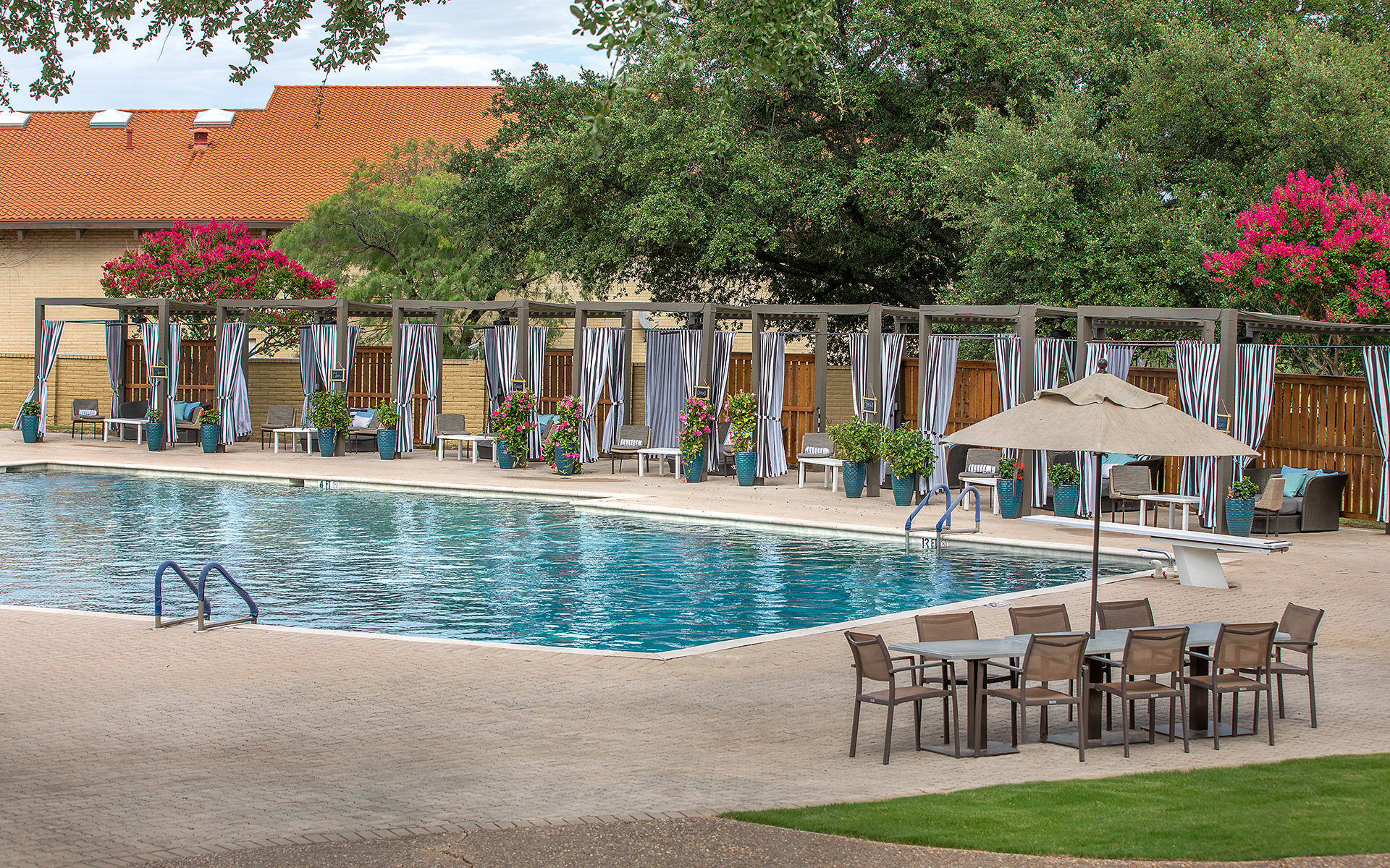 Elevate your poolside experience with a private cabana, perfect for families or small groups. These shaded retreats offer comfortable seating and convenient poolside service, ensuring a relaxing and enjoyable day for all. Reserve your cabana for a full day and create lasting memories at Las Colinas Country Club.